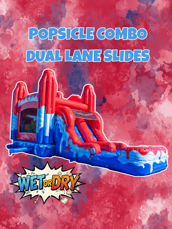 Bright, festive, and built for backyard fun, the Red White and Cool Popsicle Combo is a themed inflatable combo unit that blends a roomy bounce area with a safe, enclosed slide and playful popsicle-style accents. Designed for parties that want a splash of summer spirit, this combo typically features bold red, white, and cool blue colors, eye-catching popsicle-shaped graphics or inflatable toppings, and a sturdy entrance ramp that makes access easy for younger guests. Inside, kids get a generous bouncing field with high mesh walls so adults can keep a clear view, and the integrated slide adds extra excitement without needing a separate piece of equipment. Safety features usually include reinforced seams, non-slip ramp surfaces, and a soft landing zone at the slide’s exit. The combo is sized to fit most residential lawns yet remains roomy enough to host several children at once, making it ideal for birthdays, neighborhood block parties, school events, and summer festivals. Setup and takedown are straightforward for professional rental crews, and the unit pairs well with shade canopies or simple ground tarps. Overall, it’s a cheerful, family-friendly attraction that delivers active play, visual appeal, and easy supervision in one colorful package.